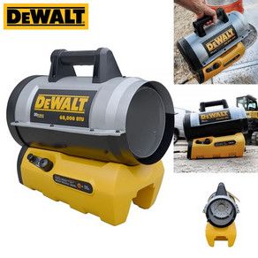무선으로 사용 가능하며 68,000BTU 출력을 제공하고 프로판 가스를 연료로 하여 캠핑이나 야외 활동에서 강력하고 편리한 난방을 지원하는 DeWALT DXH70CFAV 히터.