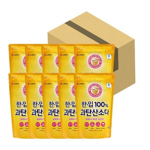 과탄산소다를 한입 크기로 간편하게 포장한 세제 제품으로, 1kg 용량 10개입 구성으로 여러 용도로 청소와 세탁에 사용 가능하며 휴대와 사용이 편리함.