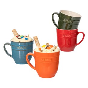 스타우브 에나멜 세라믹 머그잔 4개 세트로, 다양한 혼합색상으로 구성되어 테이블에 화사함을 더하며, 세라믹 재질로 음료를 안전하게 즐길 수 있고 견고하고 세련된 디자인으로 일상 사용과 선물용 모두 적합합니다.